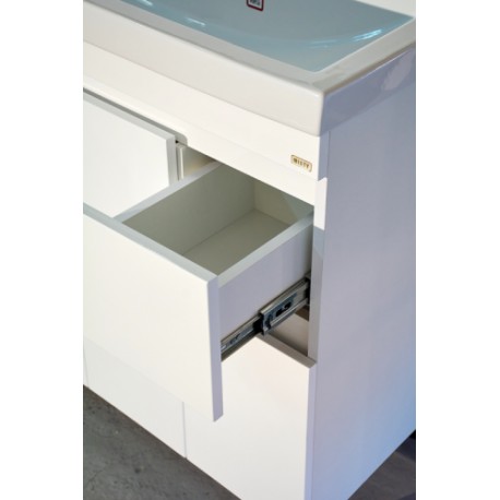 Тумбы с тонкими, четкими линиями, комплектуются накладной раковиной с прямоугольной чашей и узкими бортиками. Прямые хромированные ручки-скобы придают изящества строгой лаконичности дизайна.